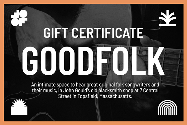 Goodfolk is an intimate space to hear great original folk songwriters and their music in John Gould’s old blacksmith shop at 7 Central Street in Topsfield, Massachusetts. Gift certificates have no expiration date and are redeemable for tickets to any of our shows. Gift certificates are not valid for food, beverage or merchandise purchases. Gift certificates are non-refundable.